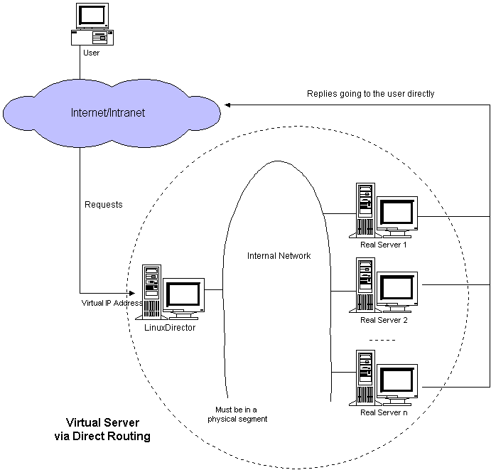This request dispatching approach is similar to the one implemented in IBM's NetDispatcher. The virtual IP address is shared by real servers and the load balancer. The load balancer has an interface configured with the virtual IP address too, which is used to accept request packets, and it directly route the packets to the chosen servers. All the real servers have their non-arp alias interface configured with the virtual IP address or redirect packets destined for the virtual IP address to a local socket, so that the real servers can process the packets locally. The load balancer and the real servers must have one of their interfaces physically linked by a HUB/Switch. The architecture of virtual server via direct routing is illustrated as follows: