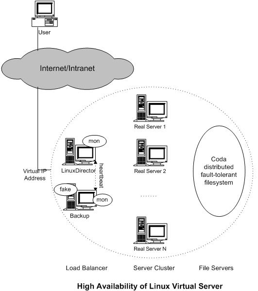 The high availability of virtual server can be provided by using of mon, heartbeat and coda software. The "mon" is a general-purpose resource monitoring system, which can be used to monitor network service availability and server nodes. The "heartbeat" code currently provides the heartbeats among two node computers through serial line and UDP heartbeats. Fake is IP take-over software by using of ARP spoofing. The architecture of this solution is illustrated in the following figure.