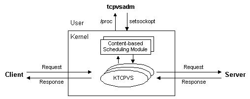 The kernel threads are used to parse the content of requests, forward them to backend servers according to scheduling rules, and relay data between client and server. The user-space program tcpvsadm is to administrator KTCPVS, it can write the virtual server rules inside the kernel through setsockopt, and read the KTCPVS rules through getsockopt or /proc file system.